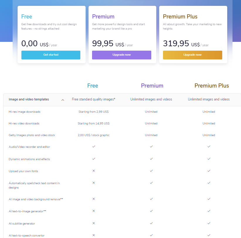 Canva offers 1 Free Plan and 2 Paid Plans starting at €9 per month.