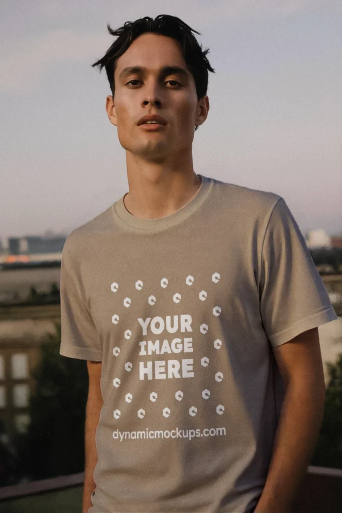 Man Wearing Beige T-shirt Mockup Front View Template