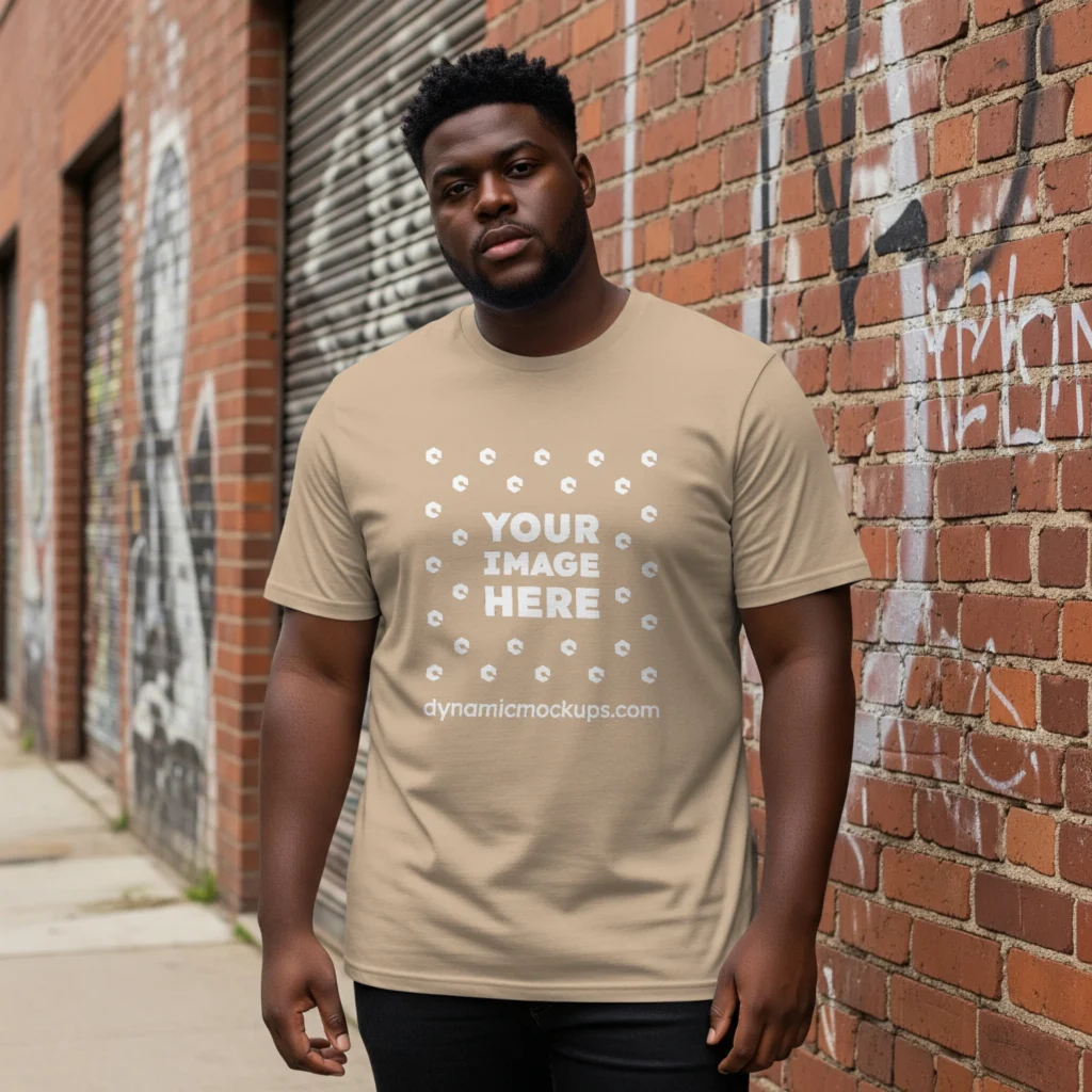 Need an Adult Black Man wearing a Beige Gildan 5000 T-shirt Mockup Template to make a realistic product design? Look no further! Our T-shirt mockup templates are perfect for bringing your creative ideas to life. These mockups add a stylish touch to any design. Download, edit online, or use Photoshop to personalize and present your T-shirt designs easily. Try Man wearing a Beige Gildan 5000 T-shirt Mockup Template #17614 now!
