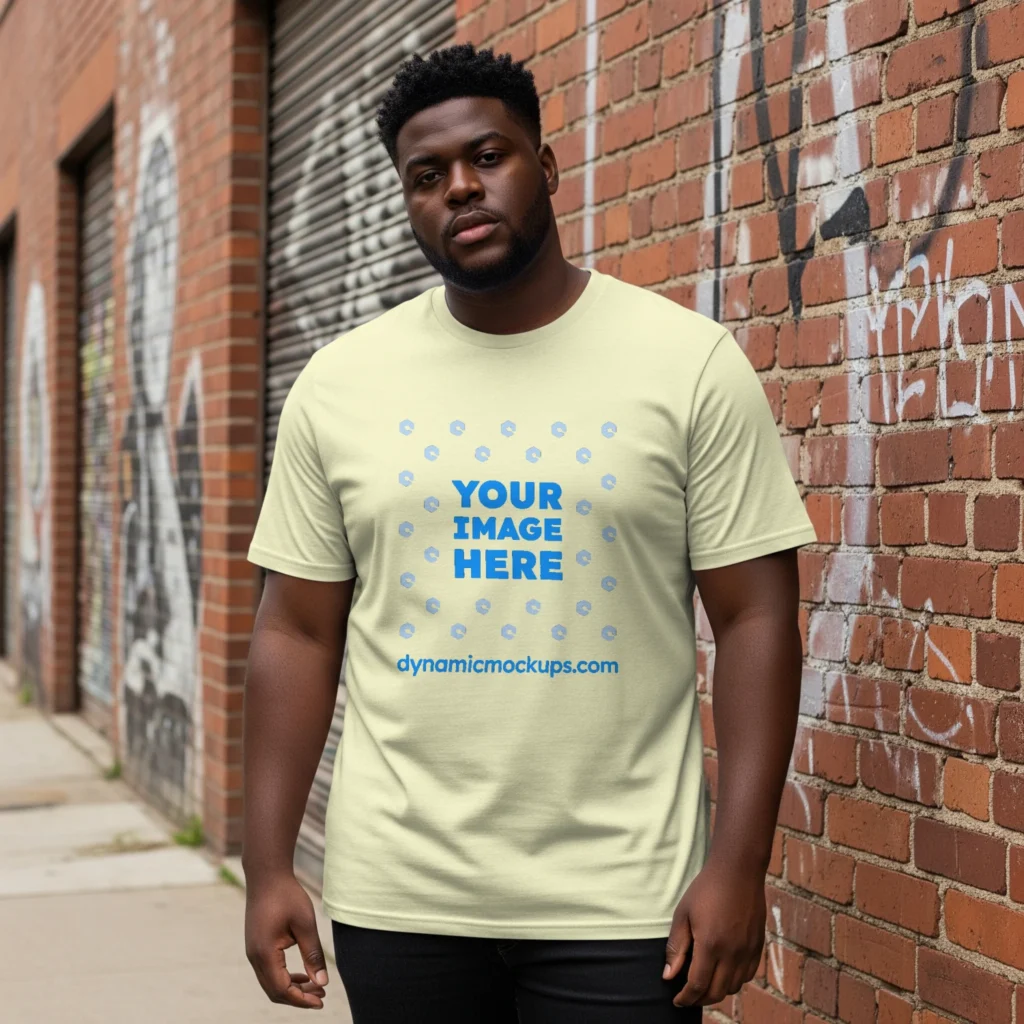 Need an Adult Black Man wearing a Cream Gildan 5000 T-shirt Mockup Template to make a realistic product design? Look no further! Our T-shirt mockup templates are perfect for bringing your creative ideas to life. These mockups add a stylish touch to any design. Download, edit online, or use Photoshop to personalize and present your T-shirt designs easily. Try Man wearing a Cream Gildan 5000 T-shirt Mockup Template #17614 now!