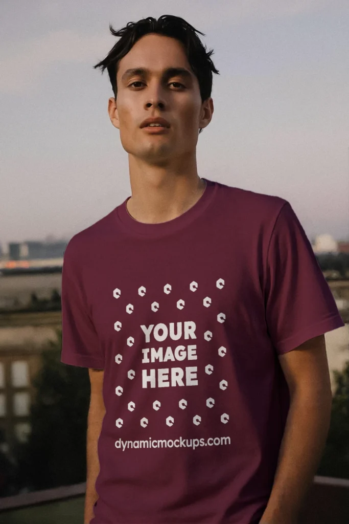 Man Wearing Maroon T-shirt Mockup Front View Template