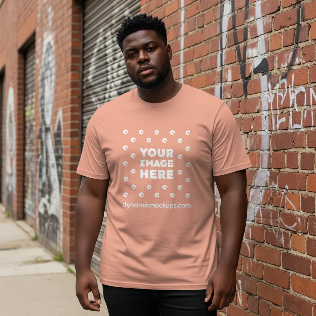 Need an Adult Black Man wearing a Peach Gildan 5000 T-shirt Mockup Template to make a realistic product design? Look no further! Our T-shirt mockup templates are perfect for bringing your creative ideas to life. These mockups add a stylish touch to any design. Download, edit online, or use Photoshop to personalize and present your T-shirt designs easily. Try Man wearing a Peach Gildan 5000 T-shirt Mockup Template #17614 now!