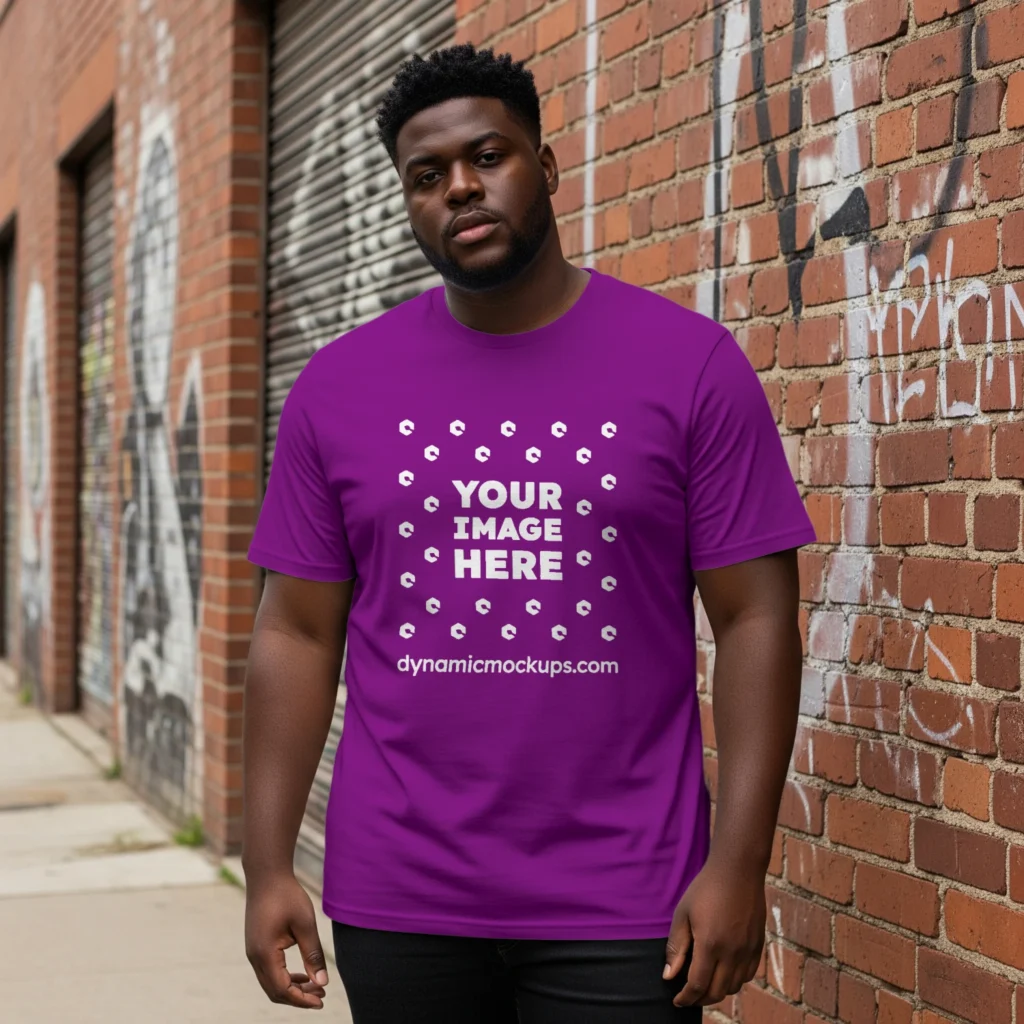 Need an Adult Black Man wearing a Purple Gildan 5000 T-shirt Mockup Template to make a realistic product design? Look no further! Our T-shirt mockup templates are perfect for bringing your creative ideas to life. These mockups add a stylish touch to any design. Download, edit online, or use Photoshop to personalize and present your T-shirt designs easily. Try Man wearing a Purple Gildan 5000 T-shirt Mockup Template #17614 now!