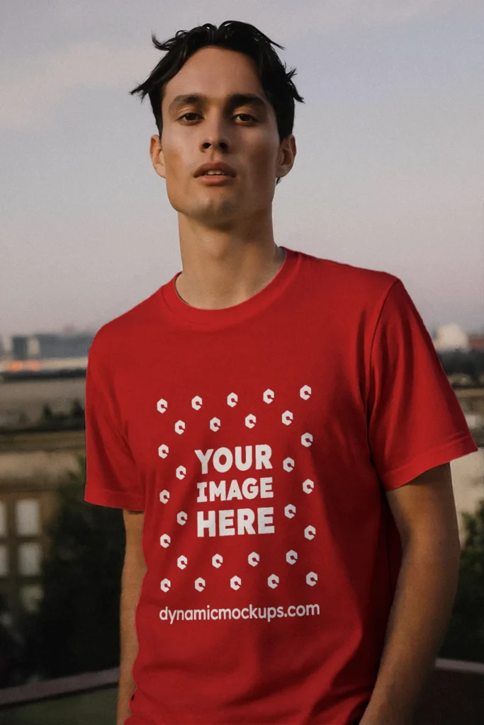 Man Wearing Red AS Colour 5082 T-shirt Mockup Template