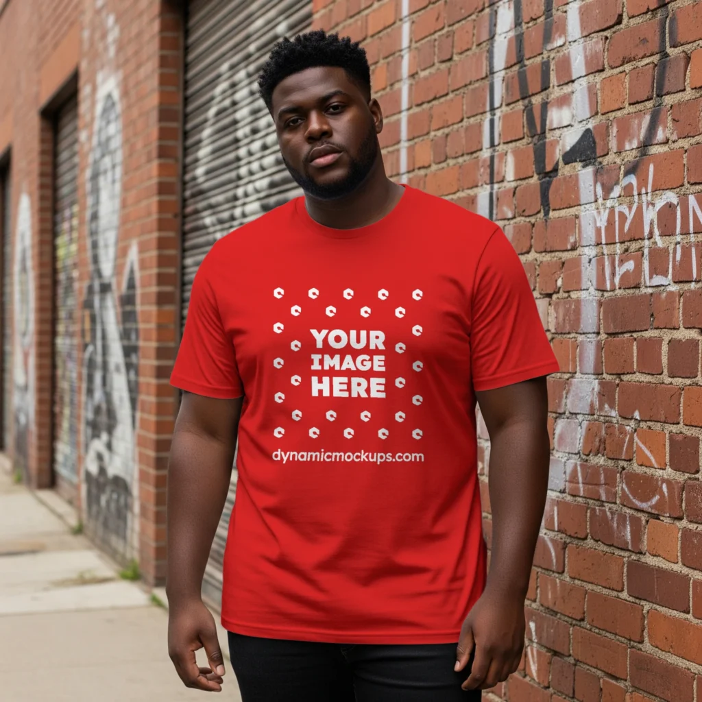 Need an Adult Black Man wearing a Red Gildan 5000 T-shirt Mockup Template to make a realistic product design? Look no further! Our T-shirt mockup templates are perfect for bringing your creative ideas to life. These mockups add a stylish touch to any design. Download, edit online, or use Photoshop to personalize and present your T-shirt designs easily. Try Man wearing a Red Gildan 5000 T-shirt Mockup Template #17614 now!