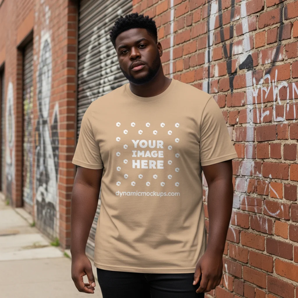 Need an Adult Black Man wearing a Tan Gildan 5000 T-shirt Mockup Template to make a realistic product design? Look no further! Our T-shirt mockup templates are perfect for bringing your creative ideas to life. These mockups add a stylish touch to any design. Download, edit online, or use Photoshop to personalize and present your T-shirt designs easily. Try Man wearing a Tan Gildan 5000 T-shirt Mockup Template #17614 now!