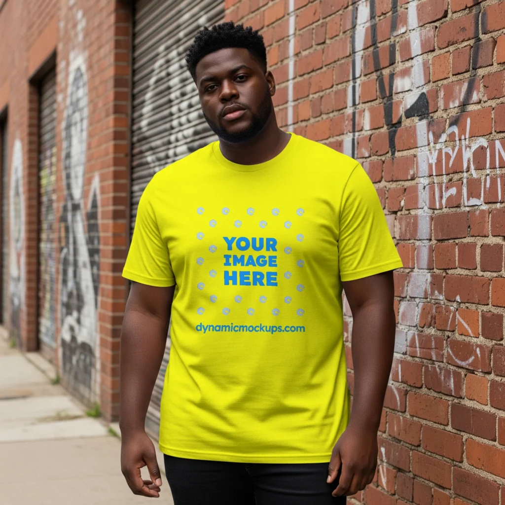 Need an Adult Black Man wearing a Yellow Gildan 5000 T-shirt Mockup Template to make a realistic product design? Look no further! Our T-shirt mockup templates are perfect for bringing your creative ideas to life. These mockups add a stylish touch to any design. Download, edit online, or use Photoshop to personalize and present your T-shirt designs easily. Try Man wearing a Yellow Gildan 5000 T-shirt Mockup Template #17614 now!