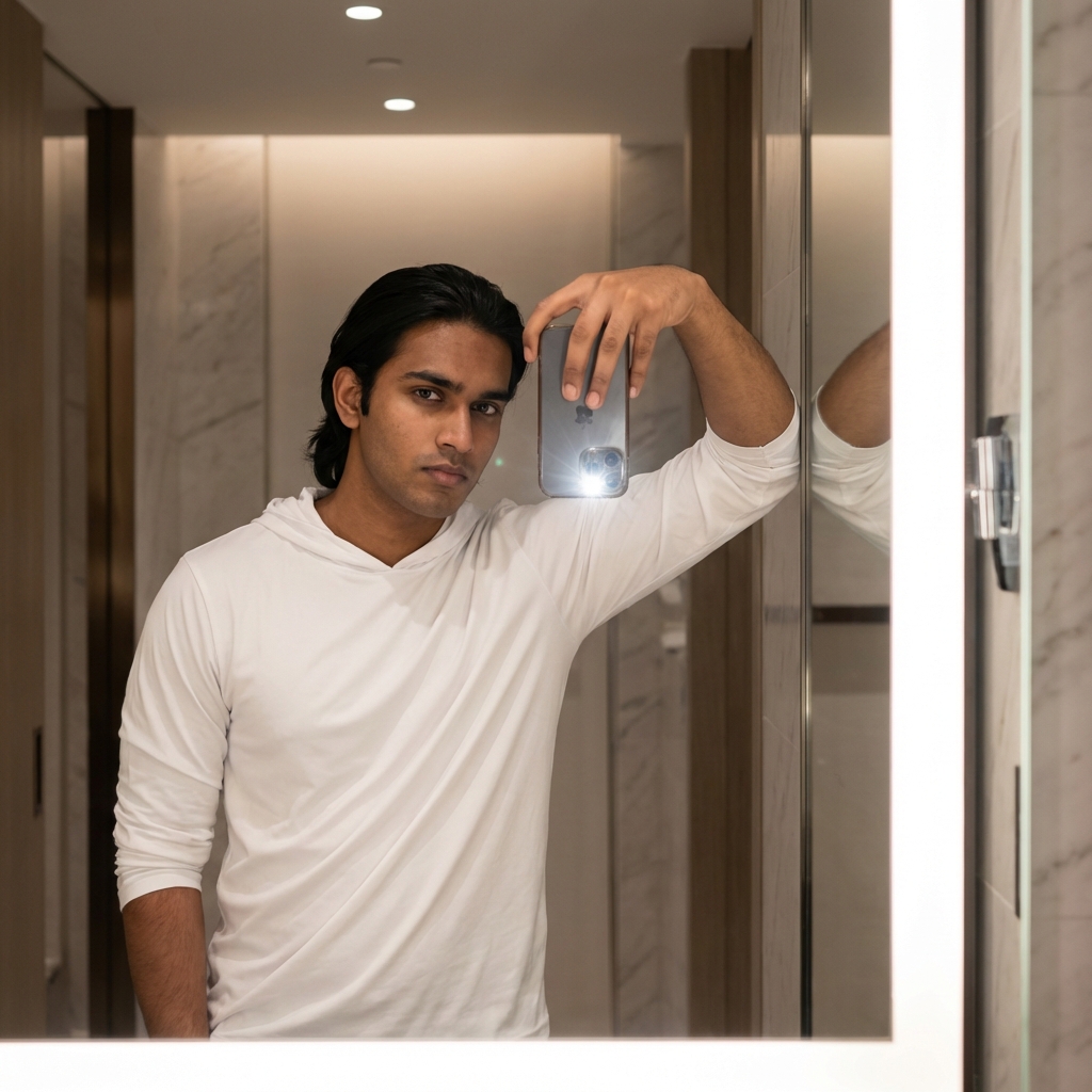 Meet Arjun, a young Indian man with a passion for photography and a day job as a software engineer. With a penchant for capturing candid moments, Arjun brings a sense of authenticity to the shoot with his natural charm and quiet confidence. Fun fact: Arjun is also a skilled amateur magician, often surprising the team with impromptu tricks between takes.