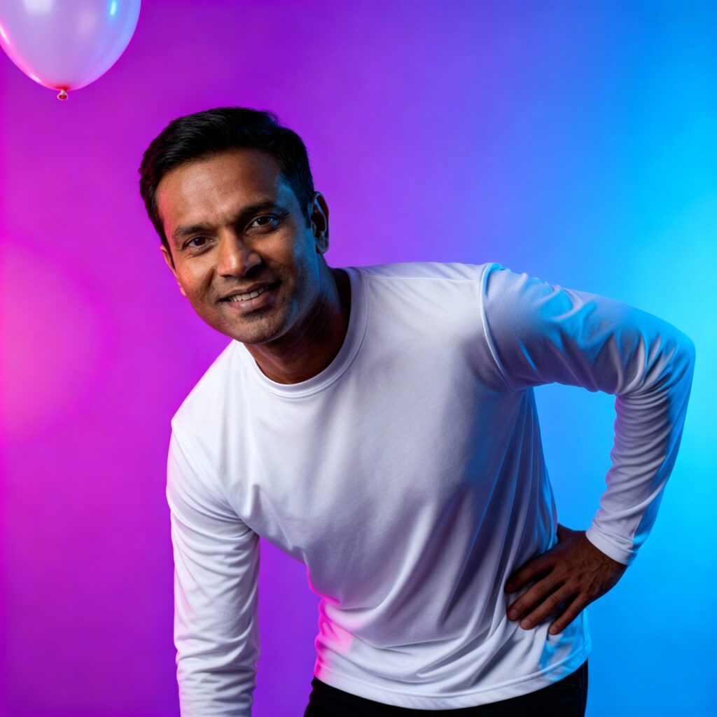 Meet Arjun, a software engineer by day and a photography enthusiast by night. With a sharp jawline and deep-set eyes, Arjun brings a sense of modern sophistication to the shoot. Fun fact: He's a huge fan of neon colors and always adds a vibrant touch to his wardrobe.