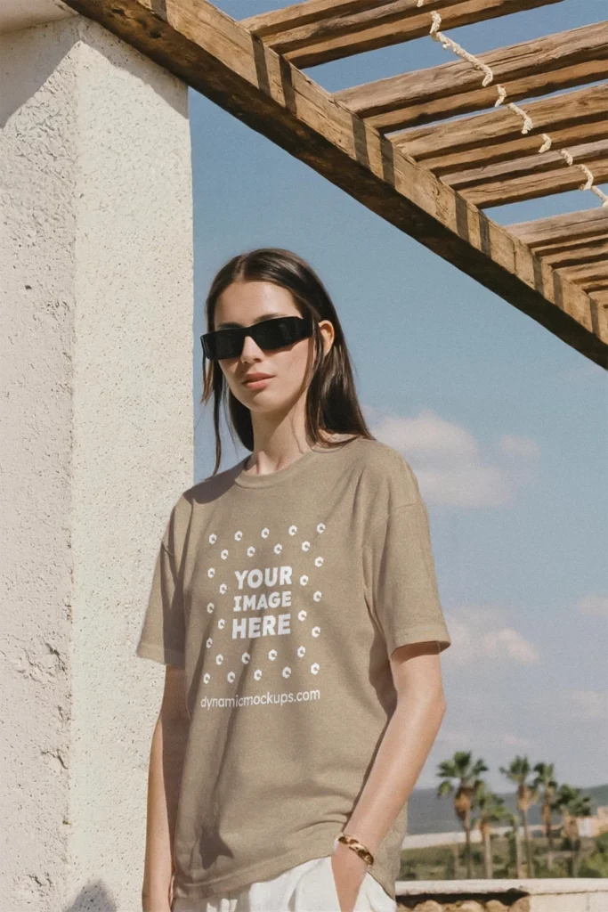 Need an Adult White Woman wearing a Beige Gildan 5000 T-shirt Mockup Template to make a realistic product design? Look no further! Our T-shirt mockup templates are perfect for bringing your creative ideas to life. These mockups add a stylish touch to any design. Download, edit online, or use Photoshop to personalize and present your T-shirt designs easily. Try Woman wearing a Beige Gildan 5000 T-shirt Mockup Template #17608 now!