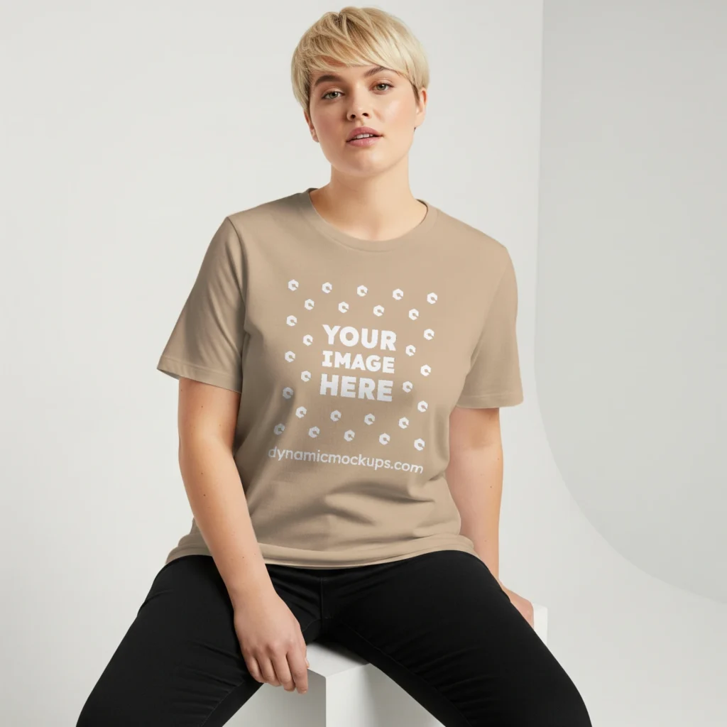Woman Wearing Beige T-shirt Mockup Front View Template