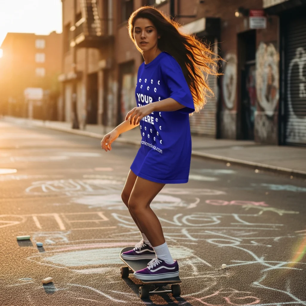 Woman Wearing Blue T-shirt Mockup Side View Template
