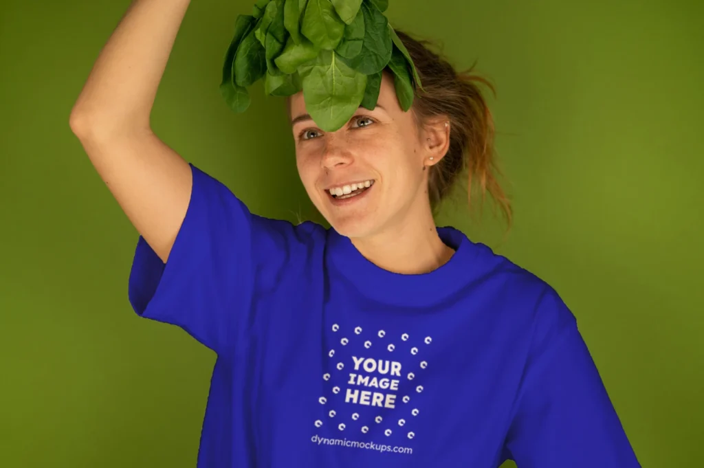 Need an Adult White Woman wearing a Blue Plain T-shirt Front View Mockup Template to make a realistic product design? Look no further! Our T-shirt mockup templates are perfect for bringing your creative ideas to life. These mockups add a stylish touch to any design. Download, edit online, or use Photoshop to personalize and present your T-shirt designs easily. Try Woman Wearing Blue T-shirt Mockup Front View Template #4943 now!