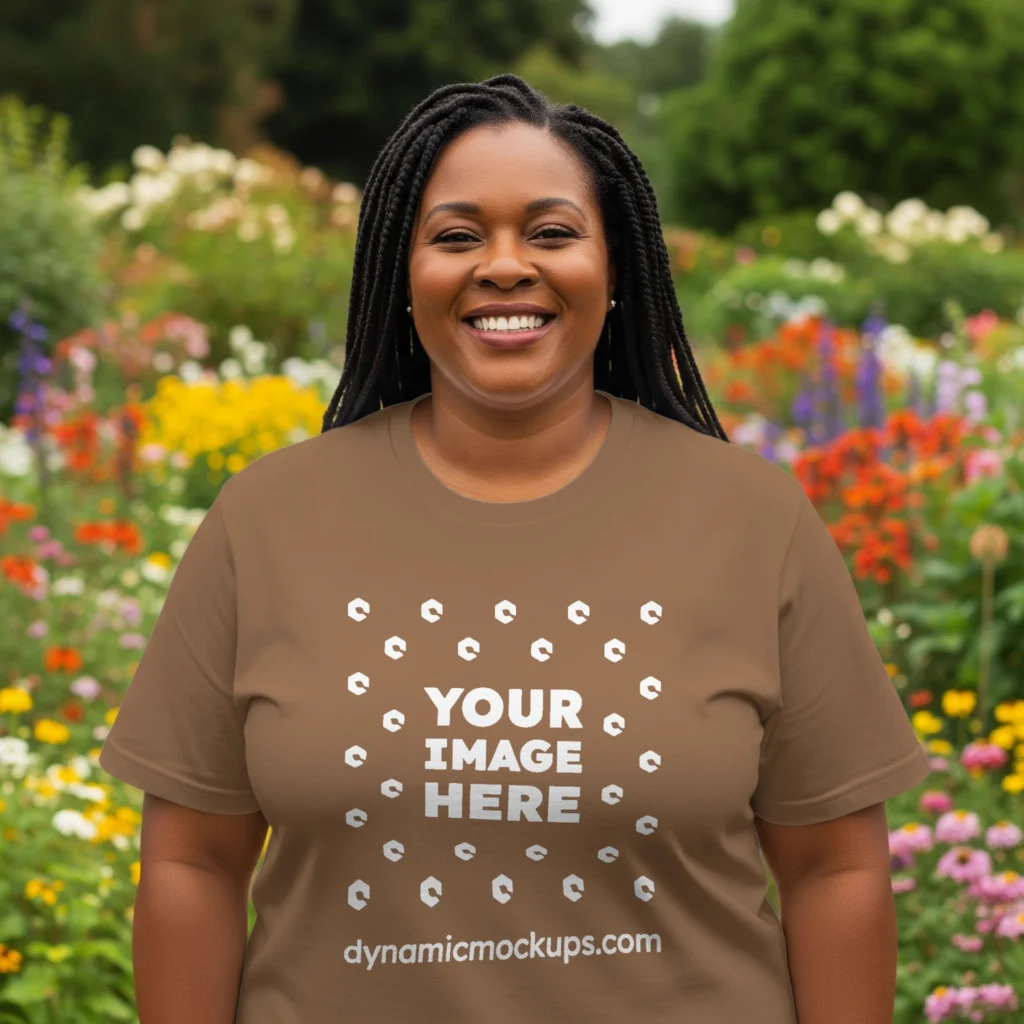 Need an Adult Black Woman wearing a Brown Gildan 5000 T-shirt Mockup Template to make a realistic product design? Look no further! Our T-shirt mockup templates are perfect for bringing your creative ideas to life. These mockups add a stylish touch to any design. Download, edit online, or use Photoshop to personalize and present your T-shirt designs easily. Try Woman wearing a Brown Gildan 5000 T-shirt Mockup Template #17615 now!