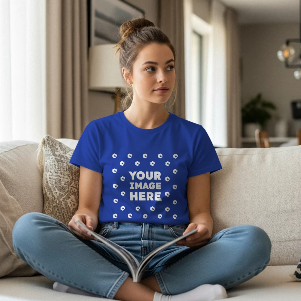 Woman Wearing Dark Blue T-shirt Mockup Front View Template