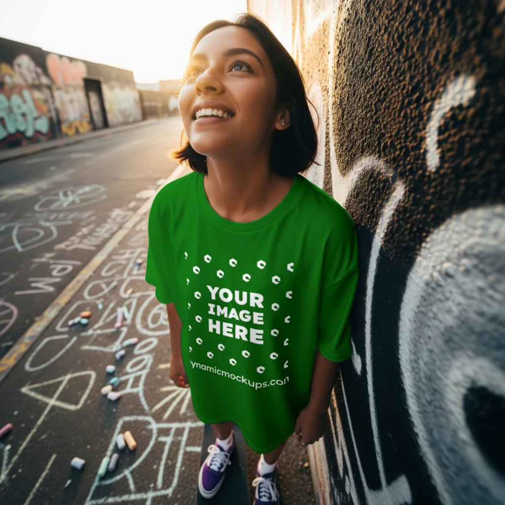 Need an Adult Hispanic Woman wearing a Green Oversized T-shirt Front View Mockup Template to make a realistic product design? Look no further! Our T-shirt mockup templates are perfect for bringing your creative ideas to life. These mockups add a stylish touch to any design. Download, edit online, or use Photoshop to personalize and present your T-shirt designs easily. Try Woman wearing a Green Oversized T-shirt Front View Mockup Template #15978 now!