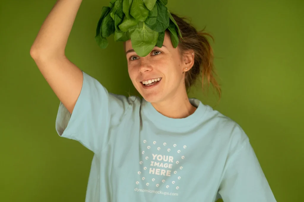 Need an Adult White Woman wearing a Light Blue Plain T-shirt Front View Mockup Template to make a realistic product design? Look no further! Our T-shirt mockup templates are perfect for bringing your creative ideas to life. These mockups add a stylish touch to any design. Download, edit online, or use Photoshop to personalize and present your T-shirt designs easily. Try Woman Wearing Light Blue T-shirt Mockup Front View Template #4943 now!