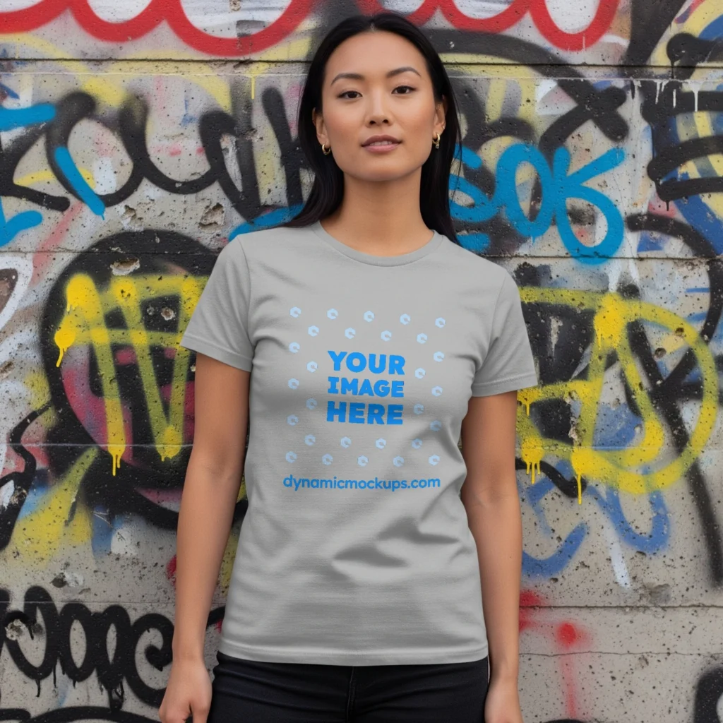 Need an Adult Asian Woman wearing a Light Gray Gildan 5000 T-shirt Mockup Template to make a realistic product design? Look no further! Our T-shirt mockup templates are perfect for bringing your creative ideas to life. These mockups add a stylish touch to any design. Download, edit online, or use Photoshop to personalize and present your T-shirt designs easily. Try Woman wearing a Light Gray Gildan 5000 T-shirt Mockup Template #17624 now!