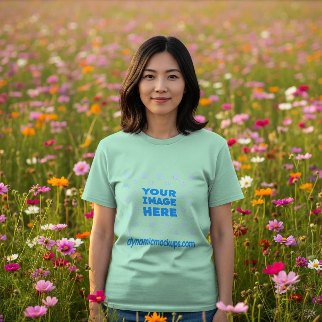 Need an Adult Asian Woman wearing a Mint Gildan 5000 T-shirt Mockup Template to make a realistic product design? Look no further! Our T-shirt mockup templates are perfect for bringing your creative ideas to life. These mockups add a stylish touch to any design. Download, edit online, or use Photoshop to personalize and present your T-shirt designs easily. Try Woman wearing a Mint Gildan 5000 T-shirt Mockup Template #17613 now!
