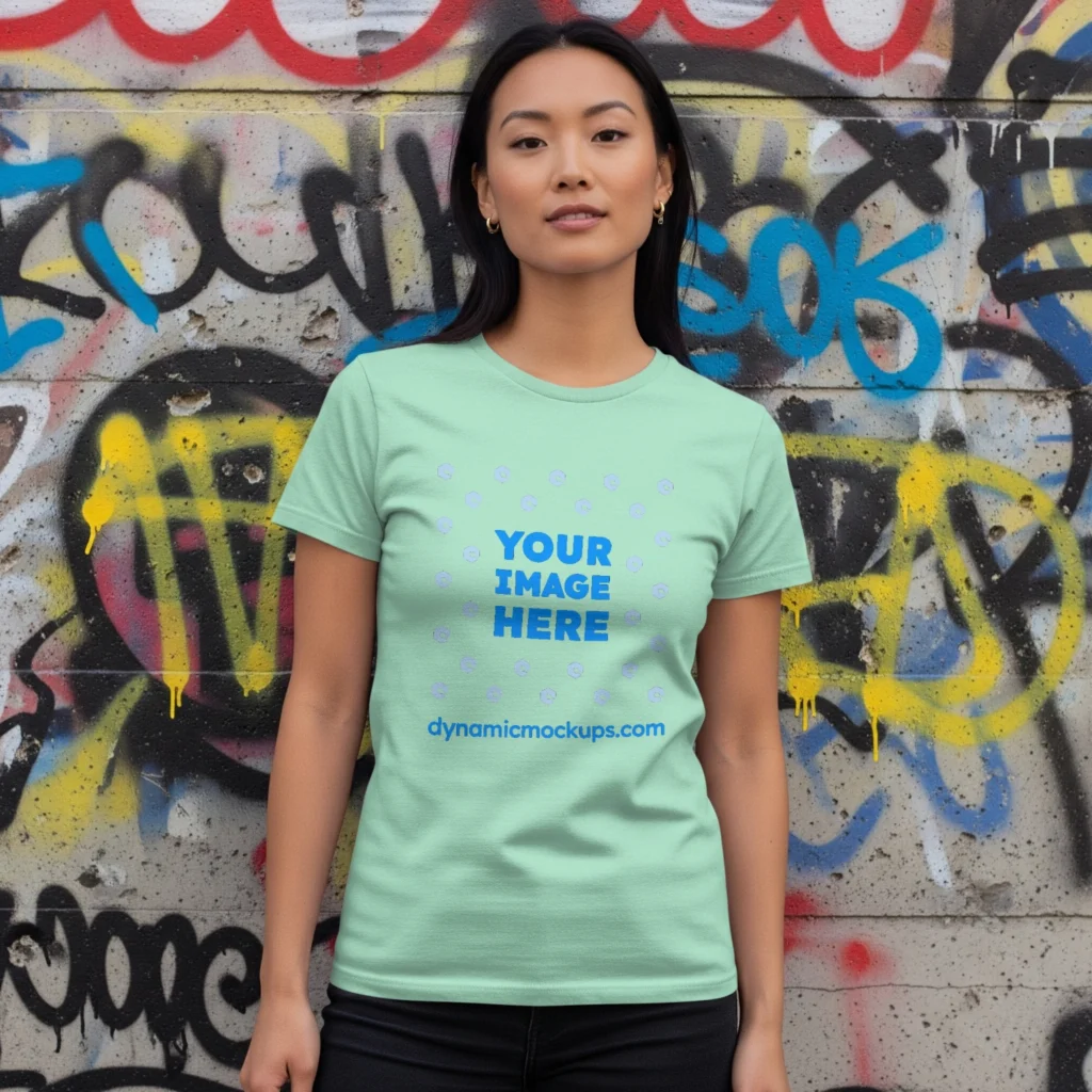 Need an Adult Asian Woman wearing a Mint Gildan 5000 T-shirt Mockup Template to make a realistic product design? Look no further! Our T-shirt mockup templates are perfect for bringing your creative ideas to life. These mockups add a stylish touch to any design. Download, edit online, or use Photoshop to personalize and present your T-shirt designs easily. Try Woman wearing a Mint Gildan 5000 T-shirt Mockup Template #17624 now!
