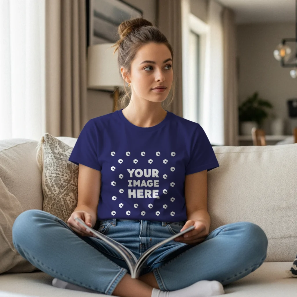 Woman Wearing Navy Blue T-shirt Mockup Front View Template