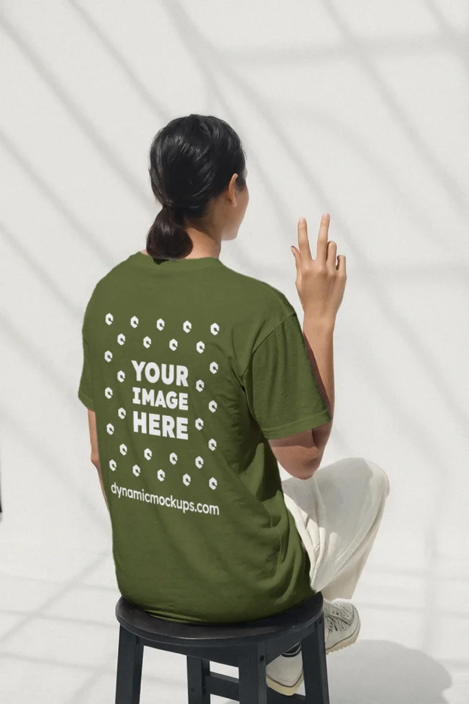 Need an Adult White Woman wearing a Olive Green Gildan 5000 T-shirt Mockup Template to make a realistic product design? Look no further! Our T-shirt mockup templates are perfect for bringing your creative ideas to life. These mockups add a stylish touch to any design. Download, edit online, or use Photoshop to personalize and present your T-shirt designs easily. Try Woman wearing a Olive Green Gildan 5000 T-shirt Mockup Template #17605 now!