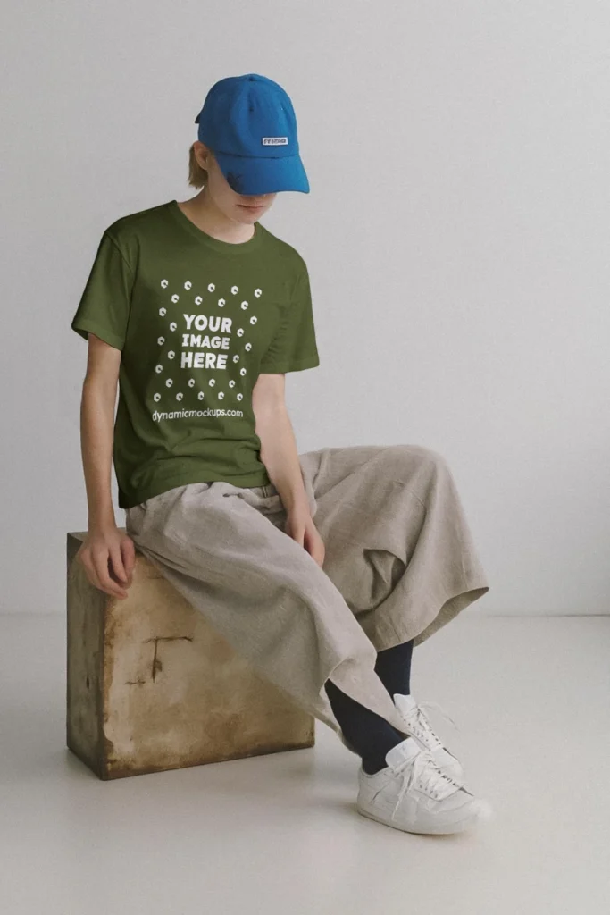 Man Wearing Olive Green T-shirt Mockup Front View Template