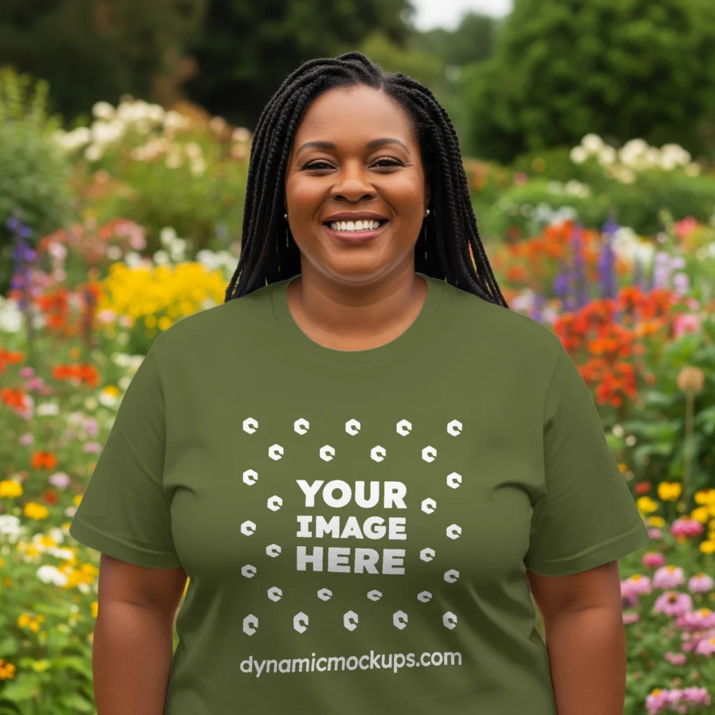 Need an Adult Black Woman wearing a Olive Green Gildan 5000 T-shirt Mockup Template to make a realistic product design? Look no further! Our T-shirt mockup templates are perfect for bringing your creative ideas to life. These mockups add a stylish touch to any design. Download, edit online, or use Photoshop to personalize and present your T-shirt designs easily. Try Woman wearing a Olive Green Gildan 5000 T-shirt Mockup Template #17615 now!