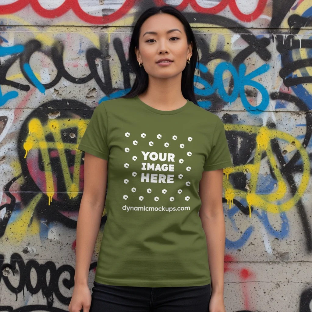 Need an Adult Asian Woman wearing a Olive Green Gildan 5000 T-shirt Mockup Template to make a realistic product design? Look no further! Our T-shirt mockup templates are perfect for bringing your creative ideas to life. These mockups add a stylish touch to any design. Download, edit online, or use Photoshop to personalize and present your T-shirt designs easily. Try Woman wearing a Olive Green Gildan 5000 T-shirt Mockup Template #17624 now!