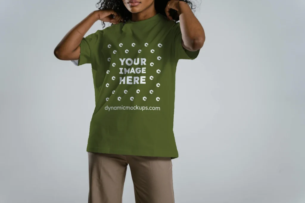 Need an Adult Black Woman wearing a Olive Green Plain T-shirt Front View Mockup Template to make a realistic product design? Look no further! Our T-shirt mockup templates are perfect for bringing your creative ideas to life. These mockups add a stylish touch to any design. Download, edit online, or use Photoshop to personalize and present your T-shirt designs easily. Try Woman Wearing Olive Green T-shirt Mockup Front View Template #6568 now!