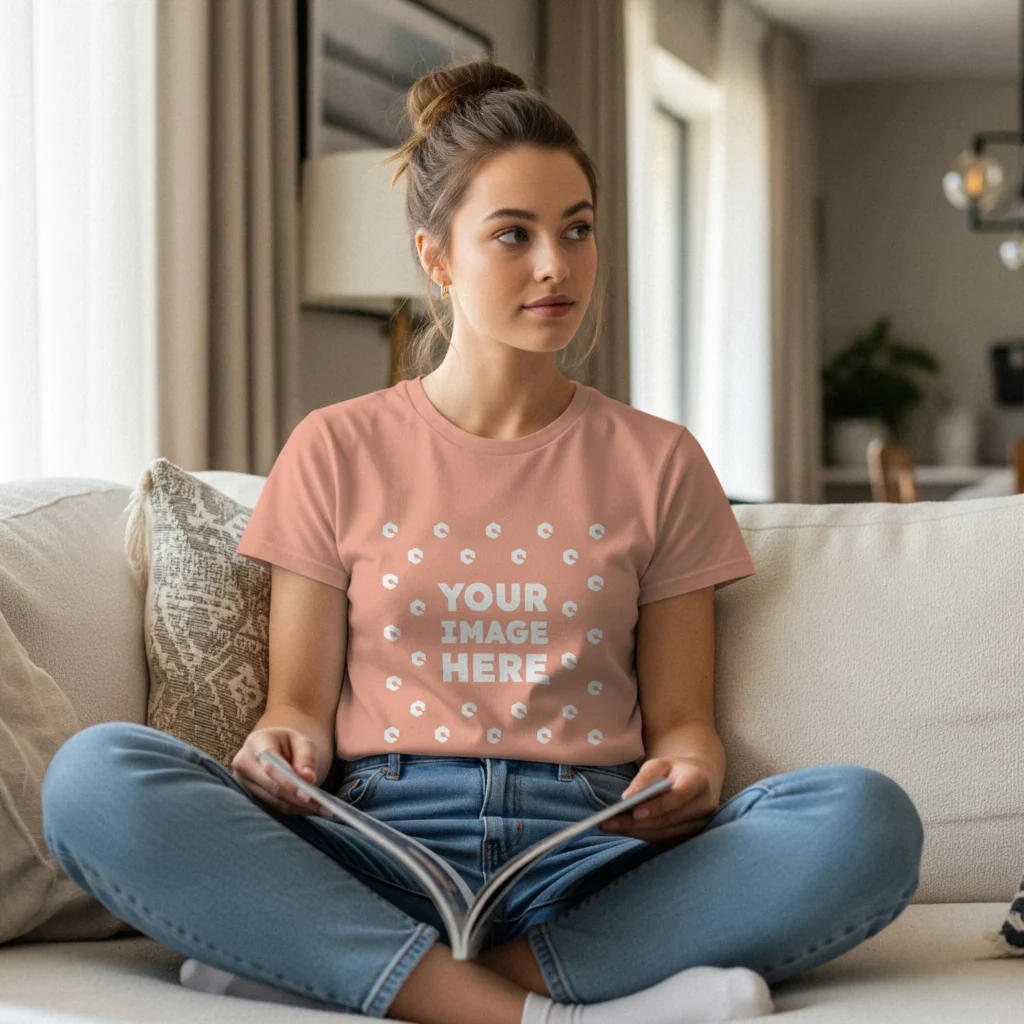 Woman Wearing Peach T-shirt Mockup Front View Template