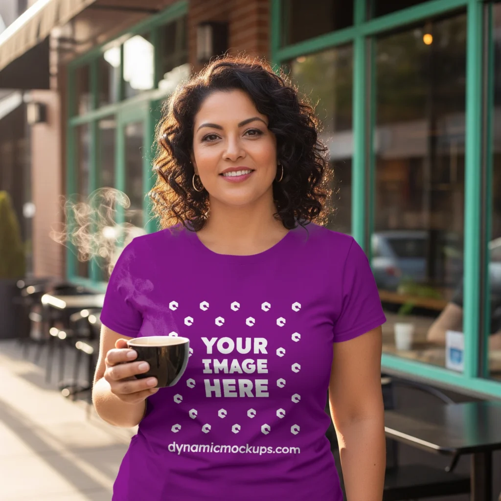 Need an Adult Hispanic Woman wearing a Purple Gildan 5000 T-shirt Mockup Template to make a realistic product design? Look no further! Our T-shirt mockup templates are perfect for bringing your creative ideas to life. These mockups add a stylish touch to any design. Download, edit online, or use Photoshop to personalize and present your T-shirt designs easily. Try Woman wearing a Purple Gildan 5000 T-shirt Mockup Template #17601 now!