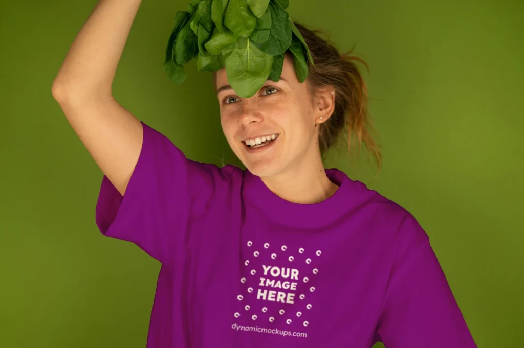 Woman Wearing Purple T-shirt Mockup Front View Template