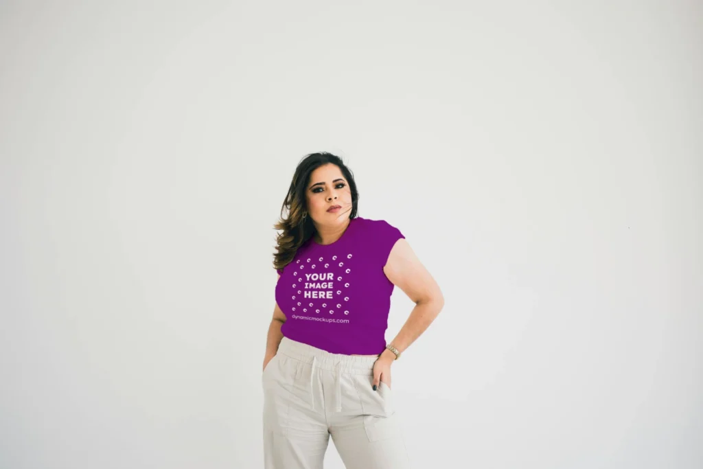 Woman Wearing Purple T-shirt Mockup Front View Template