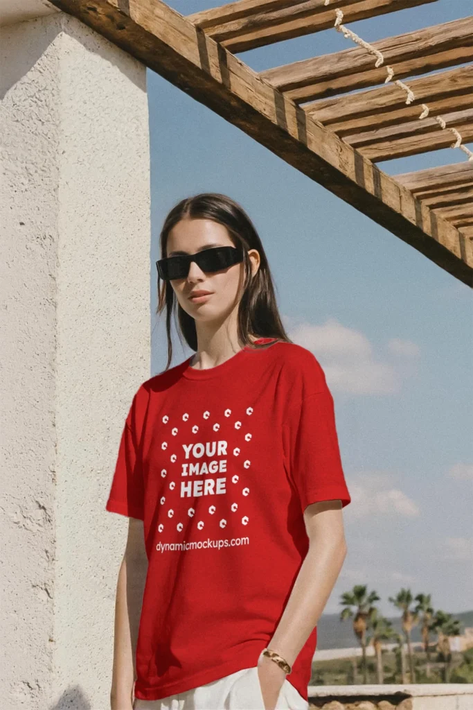 Need an Adult White Woman wearing a Red Gildan 5000 T-shirt Mockup Template to make a realistic product design? Look no further! Our T-shirt mockup templates are perfect for bringing your creative ideas to life. These mockups add a stylish touch to any design. Download, edit online, or use Photoshop to personalize and present your T-shirt designs easily. Try Woman wearing a Red Gildan 5000 T-shirt Mockup Template #17608 now!