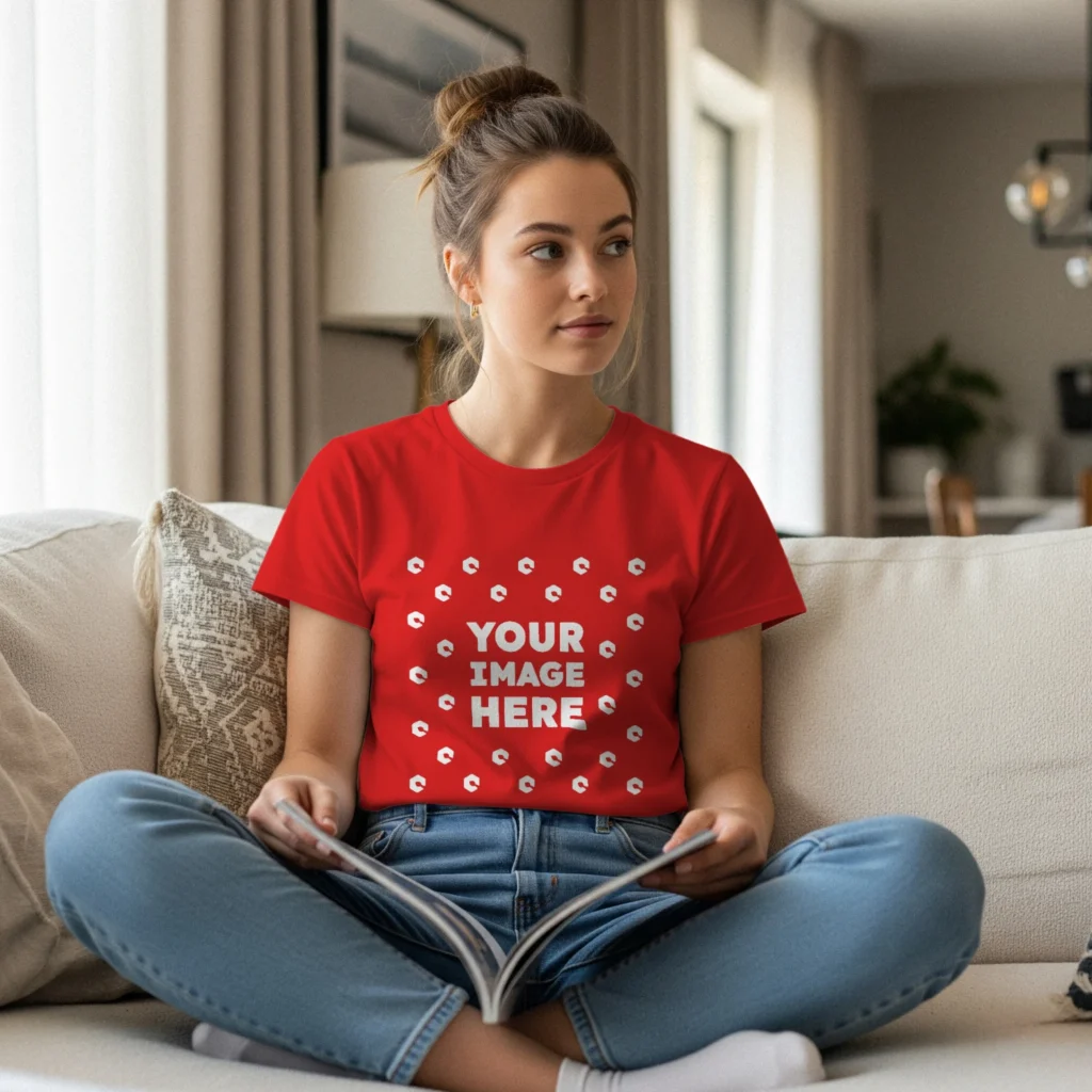 Need an Adult White Woman wearing a Red Bella Canvas 3001 T-shirt Mockup Template to make a realistic product design? Look no further! Our T-shirt mockup templates are perfect for bringing your creative ideas to life. These mockups add a stylish touch to any design. Download, edit online, or use Photoshop to personalize and present your T-shirt designs easily. Try Woman wearing a Red Bella Canvas 3001 T-shirt Mockup Template #19254 now!
