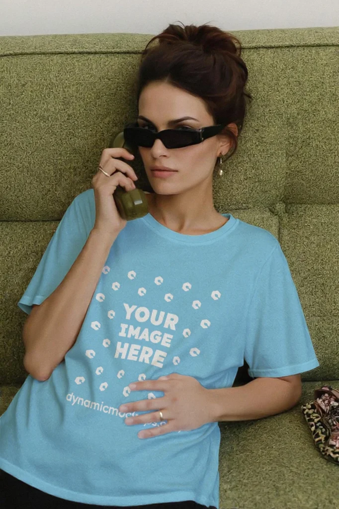 Woman Wearing Sky Blue T-shirt Mockup Front View Template