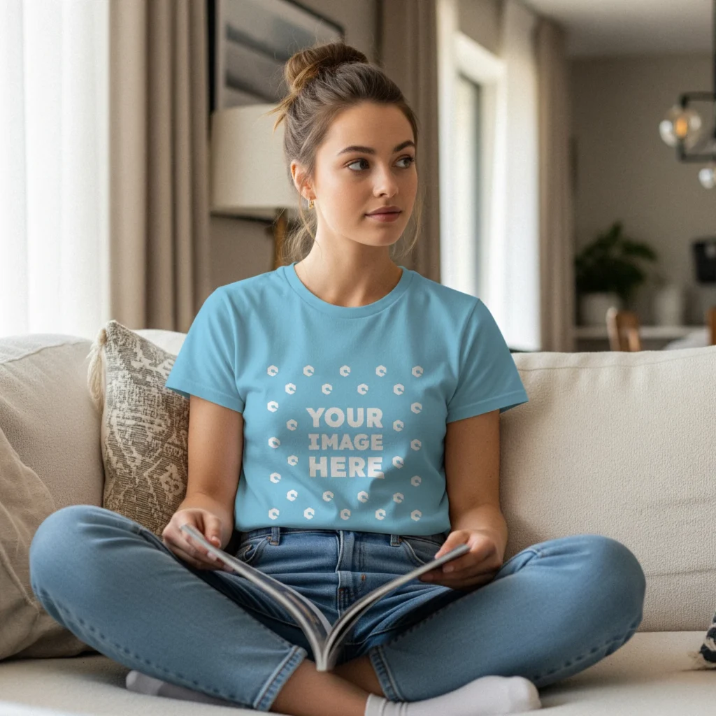 Woman Wearing Sky Blue T-shirt Mockup Front View Template