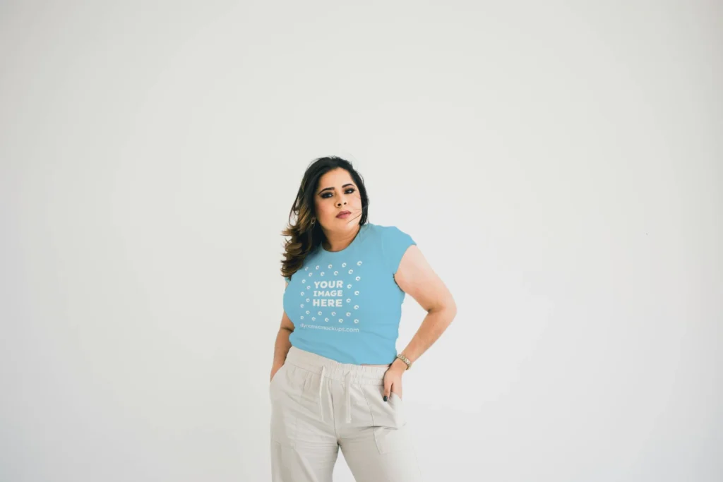 Need an Adult White Woman wearing a Sky Blue Plain T-shirt Front View Mockup Template to make a realistic product design? Look no further! Our T-shirt mockup templates are perfect for bringing your creative ideas to life. These mockups add a stylish touch to any design. Download, edit online, or use Photoshop to personalize and present your T-shirt designs easily. Try Woman Wearing Sky Blue T-shirt Mockup Front View Template #4949 now!