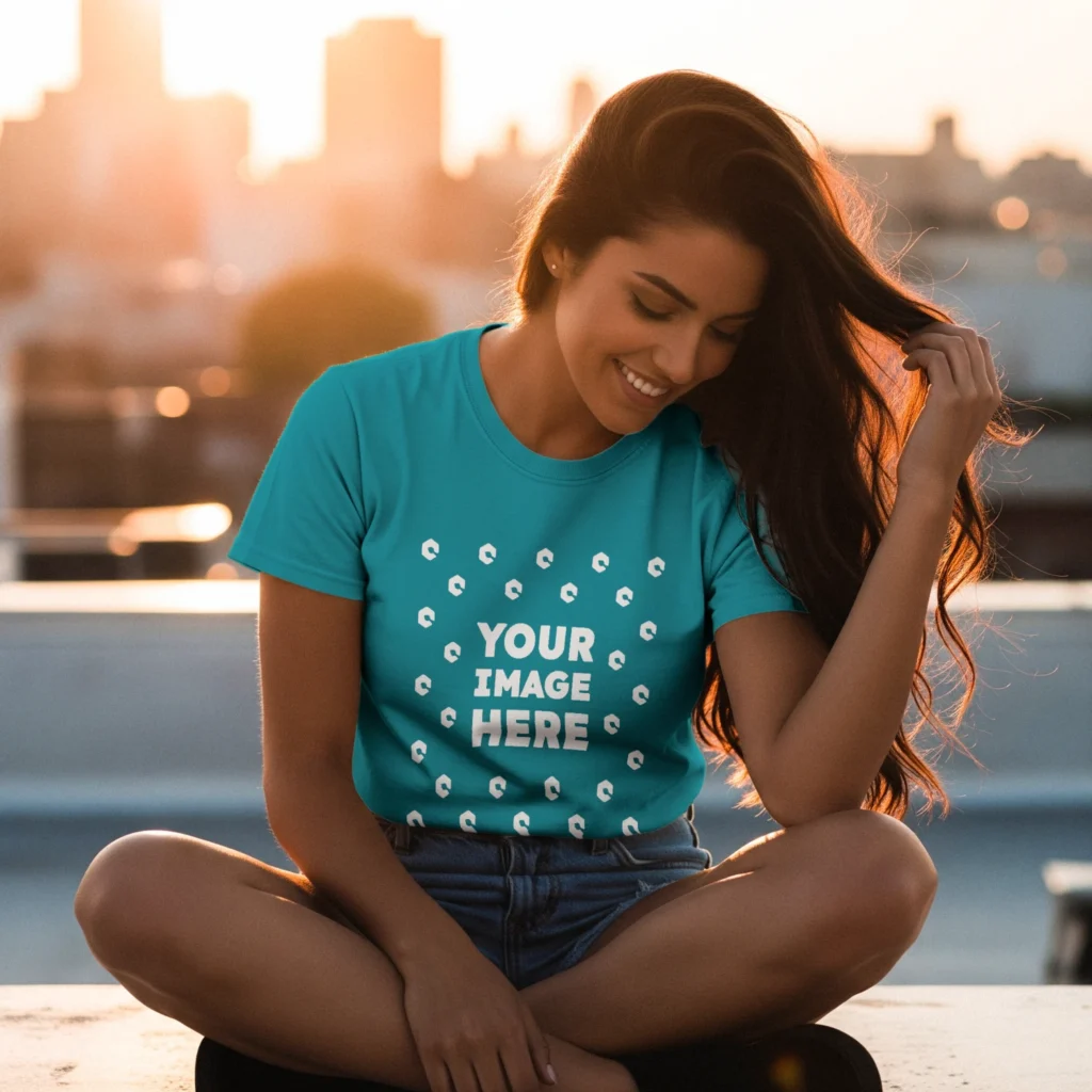 Need an Adult White Woman wearing a Teal Gildan 5000 T-shirt Mockup Template to make a realistic product design? Look no further! Our T-shirt mockup templates are perfect for bringing your creative ideas to life. These mockups add a stylish touch to any design. Download, edit online, or use Photoshop to personalize and present your T-shirt designs easily. Try Woman wearing a Teal Gildan 5000 T-shirt Mockup Template #17625 now!