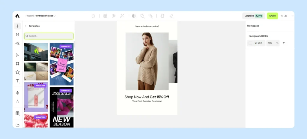 1. Master template system: Enables you to design a template with images, videos, shapes, colors, and text. This master template acts as a blueprint for all your design variations.