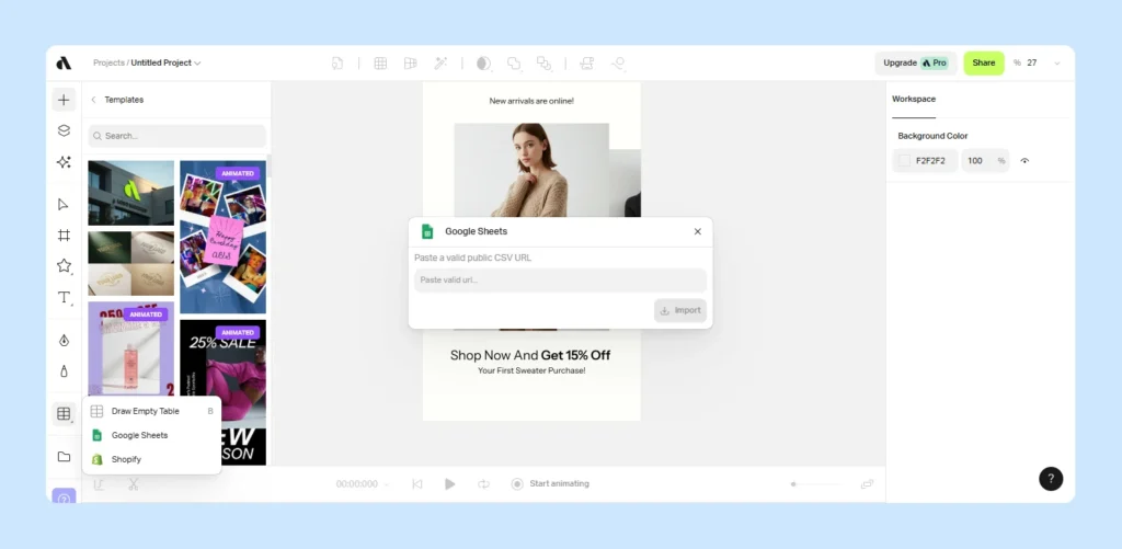 6. Integration with external data: Enables you to connect to Google Sheets, Shopify, and other platforms for real-time updates and bulk content creation as your data changes.