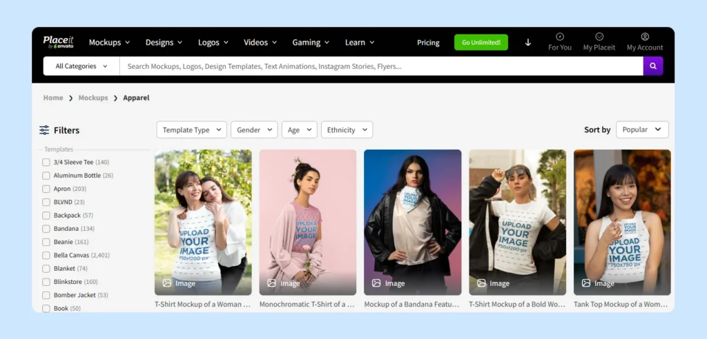 One of Placeit’s stellar features is a vast template gallery covering a wide range of categories, including: